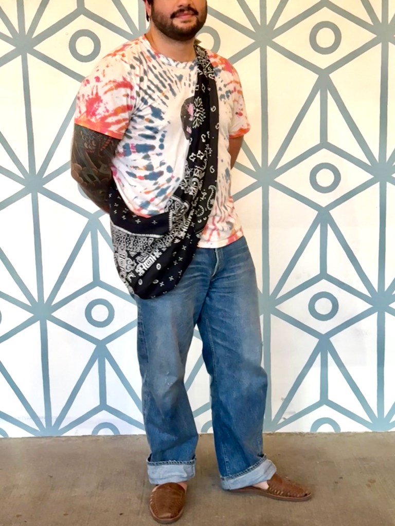 Luckily, I thought a lot about my outfit this particular day. I sort of had a feeling I was going to run into fashionable folk on our date. My camera-shy fiancée snapped a pic of me shortly after our talk with our new friends, featuring a recently purchase bandana “snufkin” bag from Kapital. I coupled this with a hand tye-dye’d tee shirt and huaraches for a sort of hippie-style abstraction.